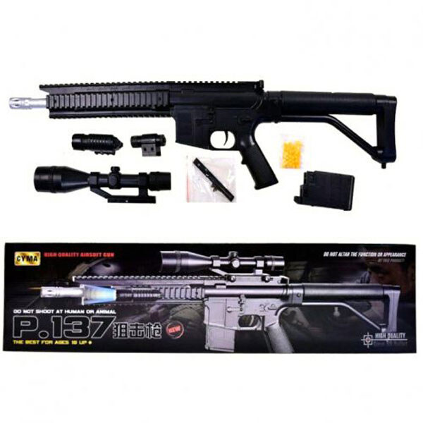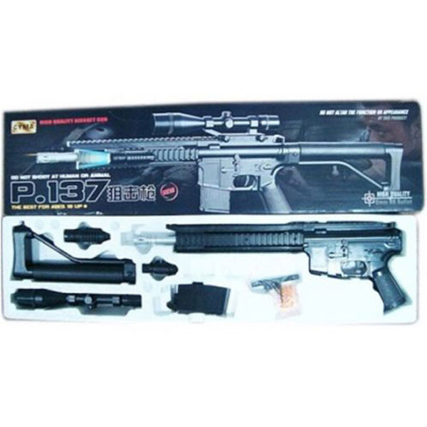 Примітка: Упаковка: Коробка | Тип ел-тів живлення: Батарейки (AG13) | Кількість ел-тів живлення: 1 | Ел-ти живлення в комплекті: Так | Вага з упаковкою: 1130 г | Вага без упаковки: 1130 г | Габарити в упаковці: 77 x 20 x 6.5 см | Габарити без упаковки: 75 x 18 x 4 см | Країна виробник: Китай | Комплектація: Автомат, ліхтарик, приціл, лазерний цілевказівник, магазин, додаткові кріплення та пластикові кульки