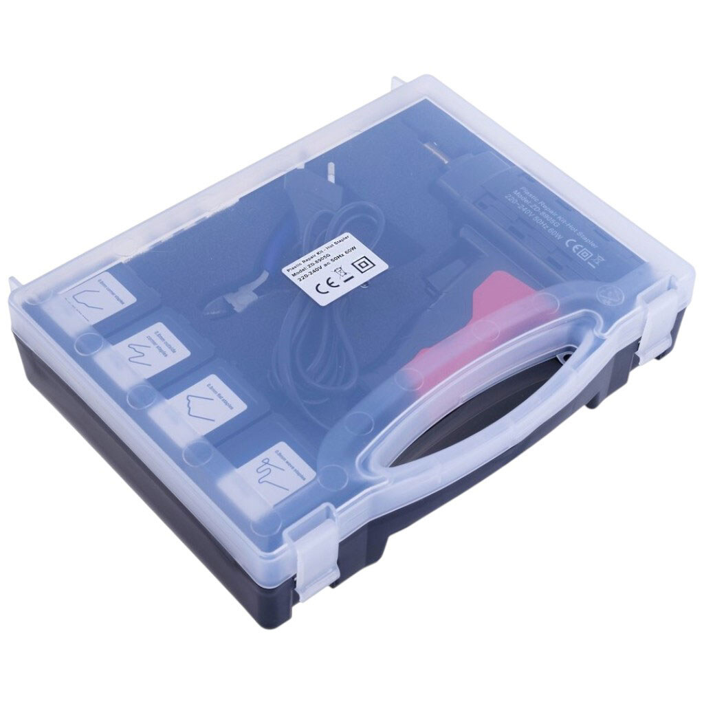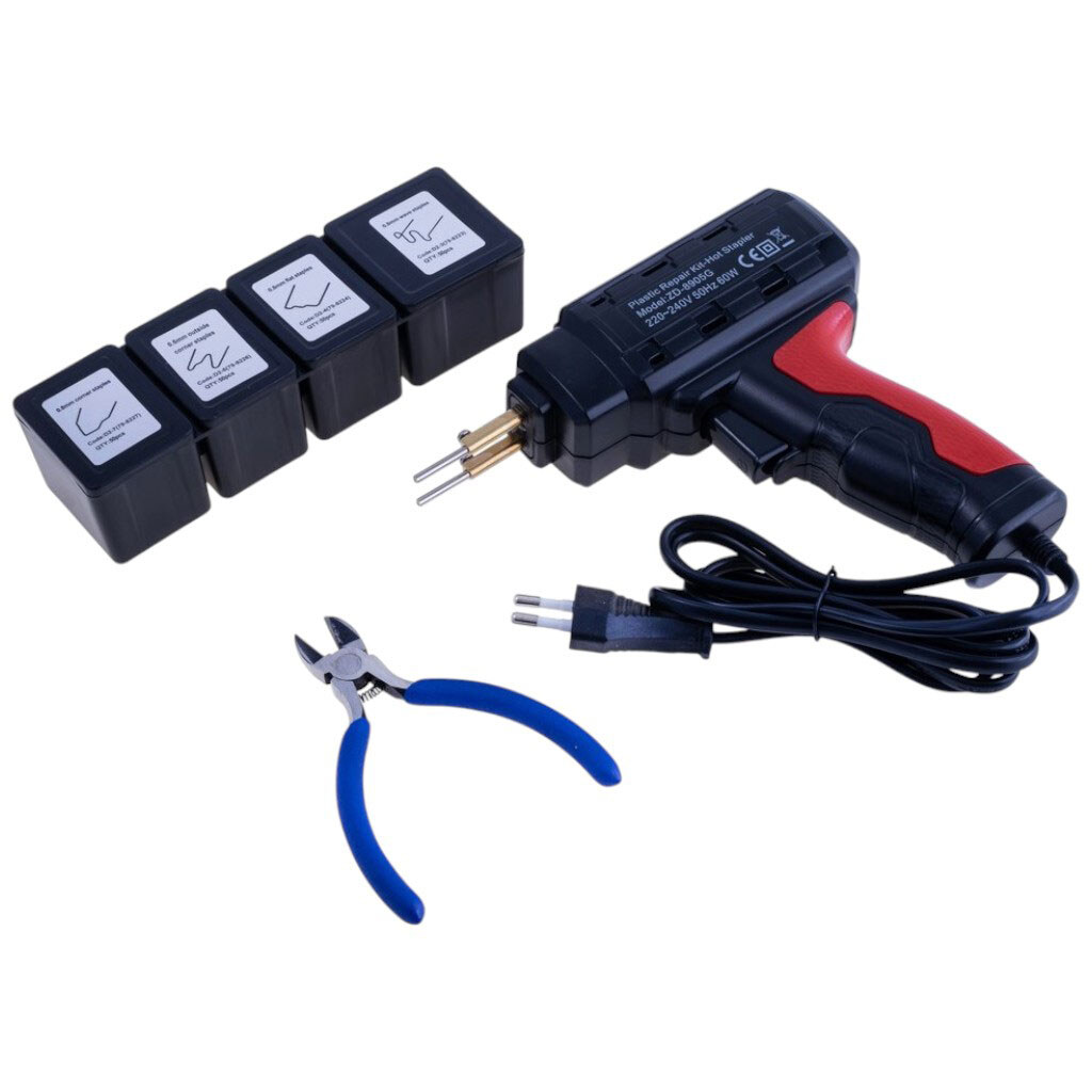Примітка: Опис: Паяльник для пластику з комплектом скоб 4х50 шт. + футляр та бокоріз. Харчування: 220VAC. Потужність 60W. Температура нагріву: 300°C. Діаметр дроту скоб: 0,8 мм. Ремонт пластикових елементів.