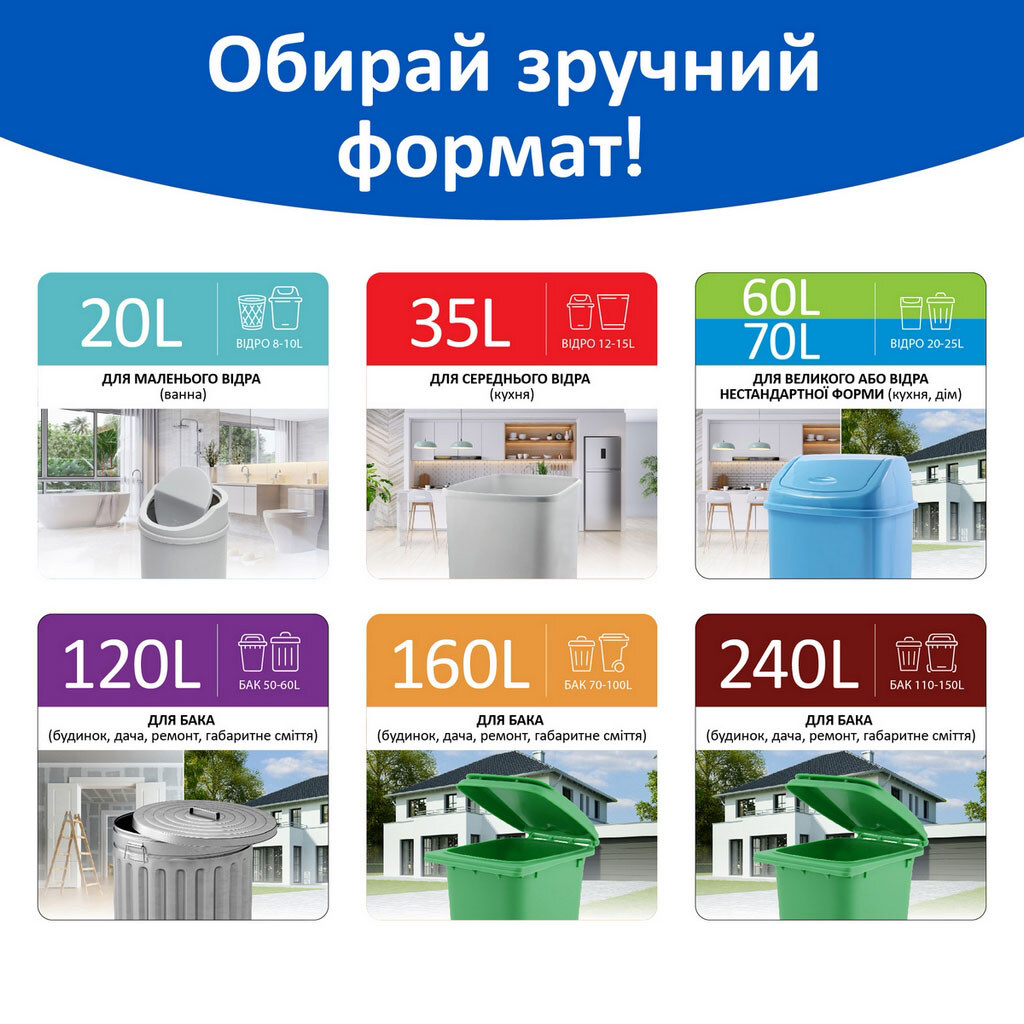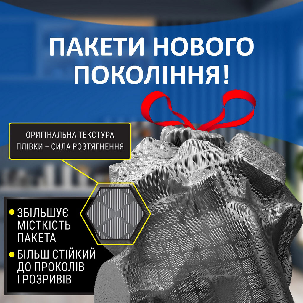 Примітка: Кількість в упаковці, шт: 10 шт | Країна виробник: Україна | Матеріал: Суміш поліетилену високого та низького тиску | Об'єм: 60 л | Особливості: З затяжками | Призначення: Для господарсько-побутових потреб