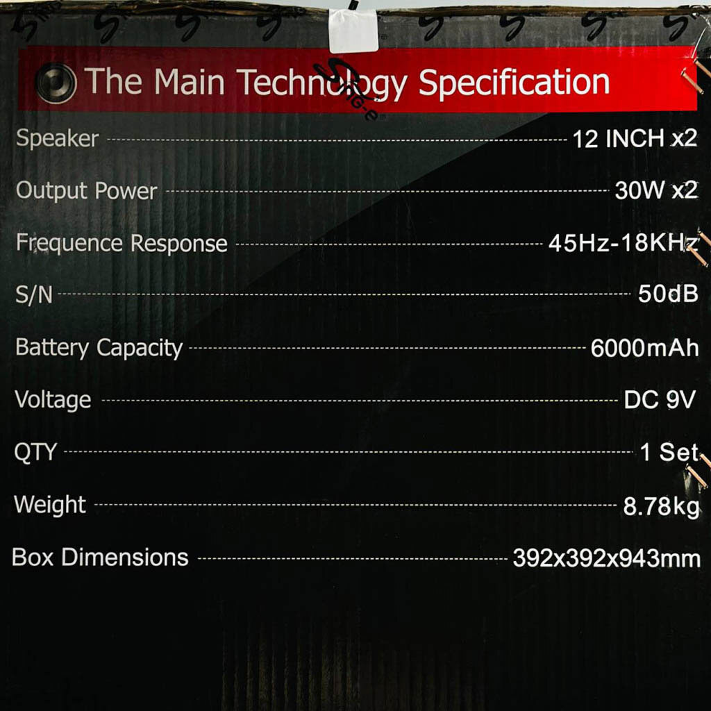 Примітка: RGB з мікрофоном 30W x 2, 6000mAh, 90.0 x 35.0 x 34.0 см