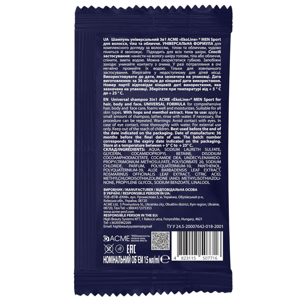 Шампунь для волосся чоловічий універсальний 3в1 EkoLine Sport саше, 15 мл