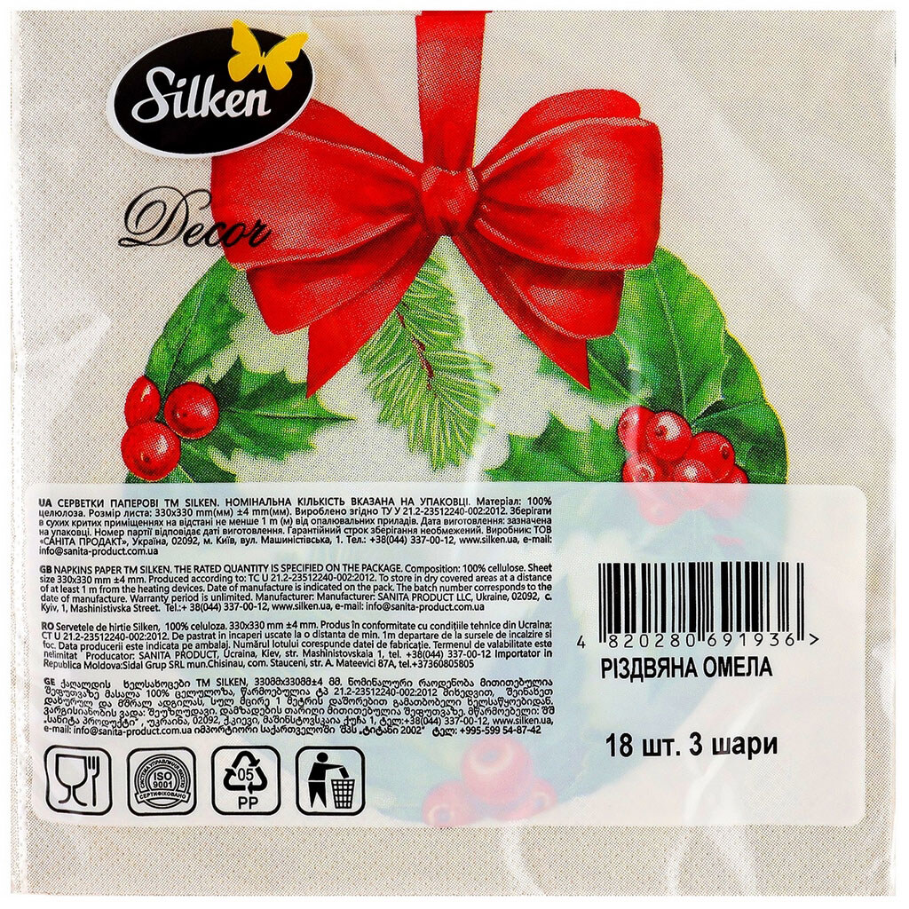 Серветки паперові Silken Різдвяна омела 3 шари 33Х33 см