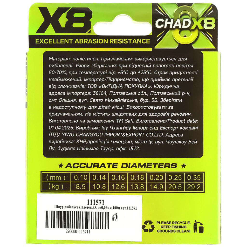 Примітка: Діаметр: 0,16 мм | Довжина: 100 м | Країна виробник: Китай | Матеріал: Поліетилен | Призначення: Для рибальського використання