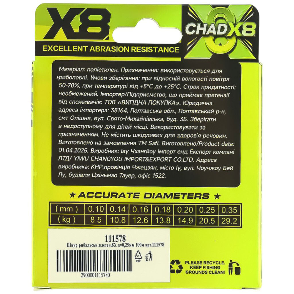 Примітка: Діаметр: 0,25 мм | Довжина: 100 м | Країна виробник: Китай | Матеріал: Поліетилен | Призначення: Для рибальського використання