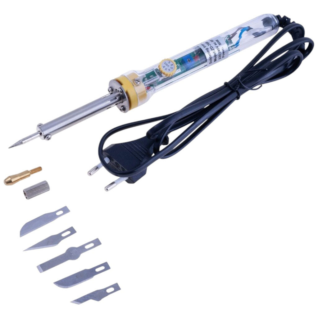 Примітка: Опис: Термоніж потужністю 30 Вт, напруга живлення: 220 В, з можливістю регулювання температури за допомогою міток температури: 200 ° С, 250 ° С, 300 ° С, 350 ° С, 400 ° С, 450 ° С. Нихромовий нагрівальний елемент. 6 насадок.