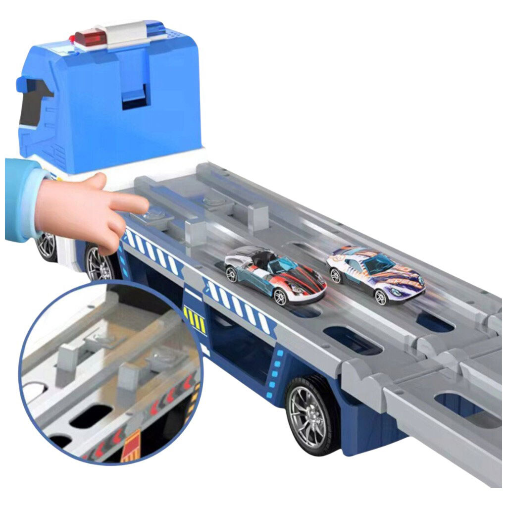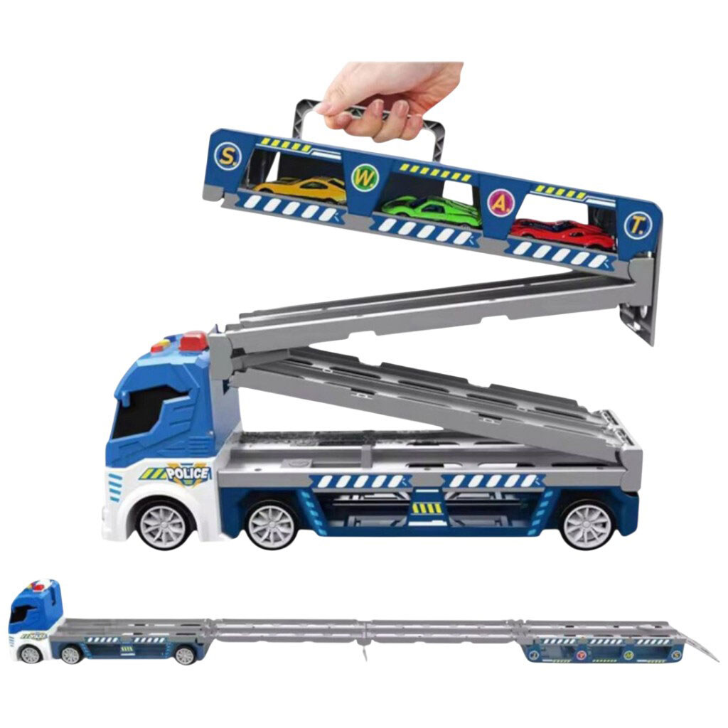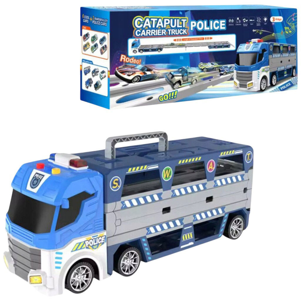 Трейлер-трек "Поліція", розмір 38х10.5х15 см, довжина треку 135 см, механічний запускач, підсвічування, звук, 2 металопластикові моделі, 6 пластикових моделей, в коробці, Tuosiqi