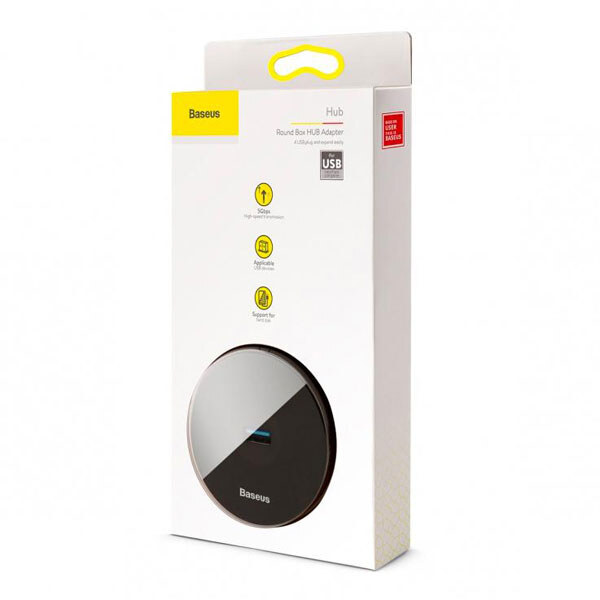 Baseus Round Box - це зручний та функціональний адаптер, який підключається до ПК або ноутбука за допомогою інтерфейсу USB. Модель дозволяє значно розширити функціональність пристрою, додавши до його арсеналу 4 USB-порти, три з яких - USB 2.0, що дозволяють підключити різні периферійні пристрої, зарядки, флешки тощо. Один роз'єм USB 3.0 розрахований для підключення зовнішніх накопичувачів та флешок та забезпечує швидкість передачі даних до 5 Гбіт/с. Три порти USB 2.0 дадуть можливість задіяти додаткові миші, клавіатури, геймпади та інші USB-пристрої, у яких не є важливою швидкість передачі даних. І до цього ще один маленький бонус - порт microusb з підтримкою жорстких дисків з об'ємом до 4 ТБ.