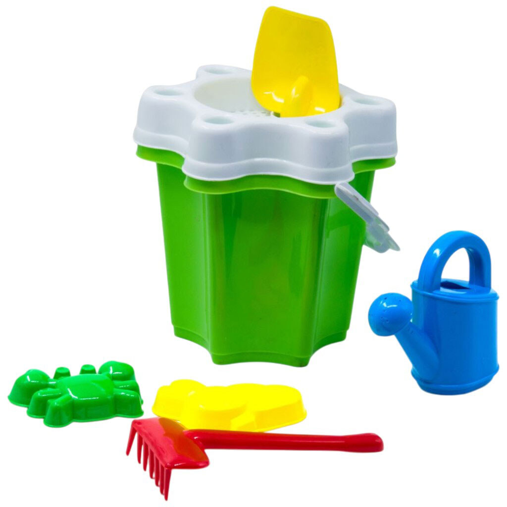 Примітка: Упаковка: Сітка | Вага в упаковці: 485 г | Габарити в упаковці: 35 x 22 x 20 см | Країна виробник: Україна | Комплектація: Відро, сито, лійка, лопатка, граблі, 2 пасочки